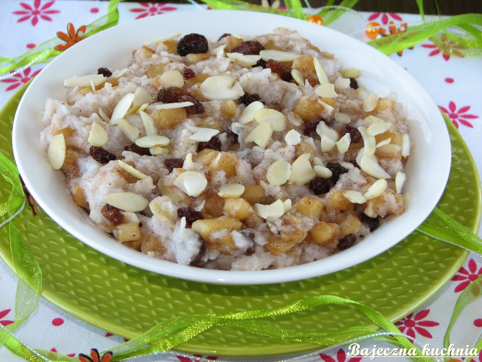 Szybki deser z płatków ryżowych, bakalii oraz duszonego jabłka z cynamonem. Jest bardzo smaczny, możemy przygotować go na drugie śniadanie lub podwieczorek.
